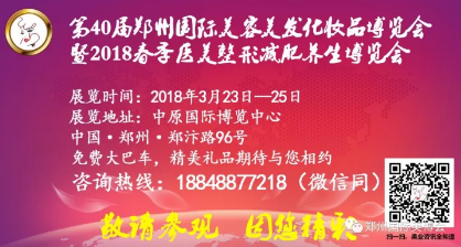 最后,2018年鄭州美博會招展火熱進行中,你是否已經按耐不住了呢?招展電話:0371-66200988。當然關注鄭州美博會微信公眾號也是一個不錯的選擇哦!歡迎拿出微信搜索“鄭州美博會”關注我們,隨時獲得最新的鄭州美博會信息!