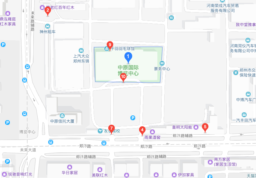 機場高速鄭州南出口下,沿中州大道北行至鄭汴路口向西轉(zhuǎn)上鄭汴路直行1.8公里即至中原國際博覽中心。