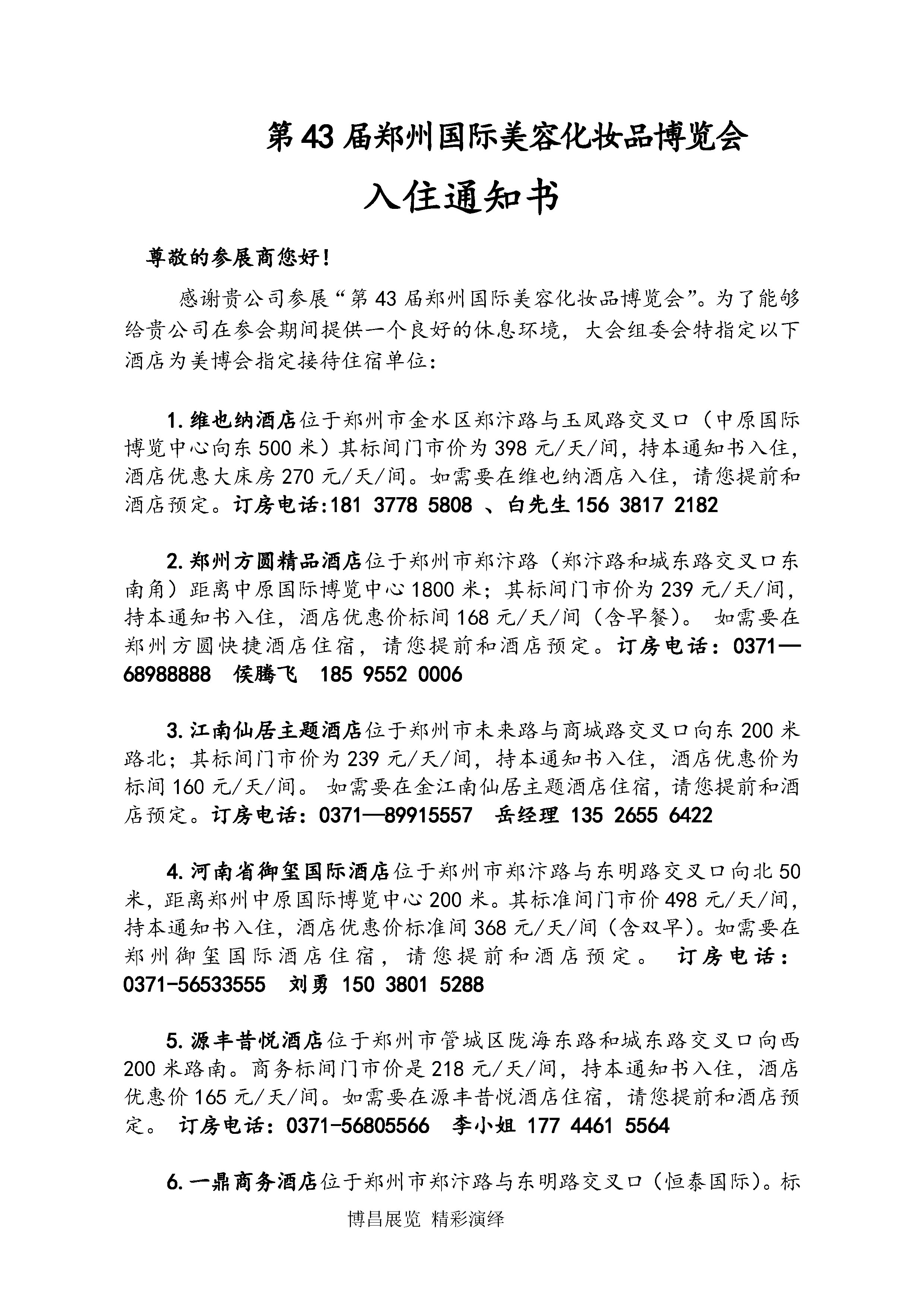 今天把第43屆鄭州國際美博會入住通知書提供給大家,讓您參展不愁,抓緊時間提前預約吧!