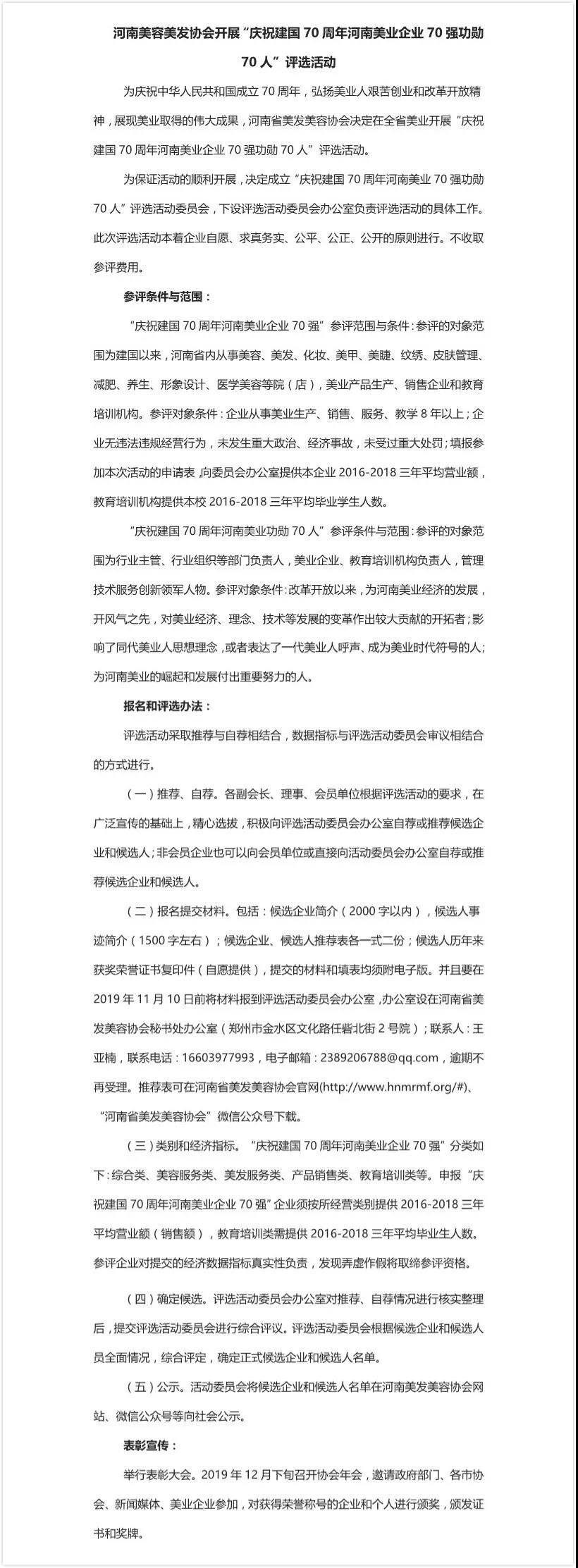 關(guān)于河南美容美發(fā)協(xié)會(huì)開展“慶祝建國(guó)70周年河南美業(yè)企業(yè)70強(qiáng)功勛70人”評(píng)選活動(dòng)的通知