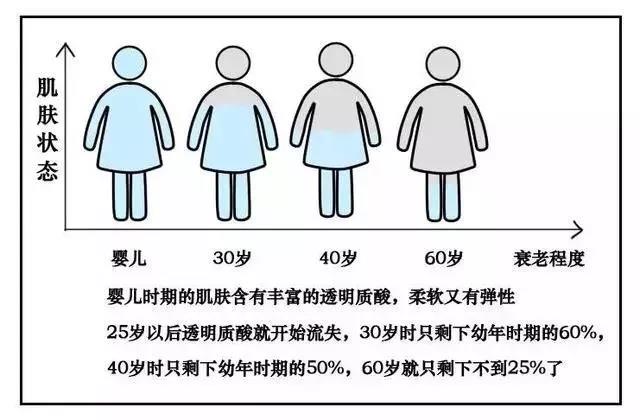 隨著年齡增長,我們體內(nèi)的透明質(zhì)酸在流失,承載水分的透明質(zhì)酸少了,皮膚水分隨之減少,出現(xiàn)細(xì)紋、皺紋以及皮膚松弛。一個(gè)保養(yǎng)小常識就是,不管做什么保養(yǎng)第一步都是補(bǔ)水,最后一步都是防曬,敲黑板了同學(xué)們,因?yàn)樽贤饩€會加速透明質(zhì)酸HA流失破壞,補(bǔ)充水分并和防曬是重中之重。